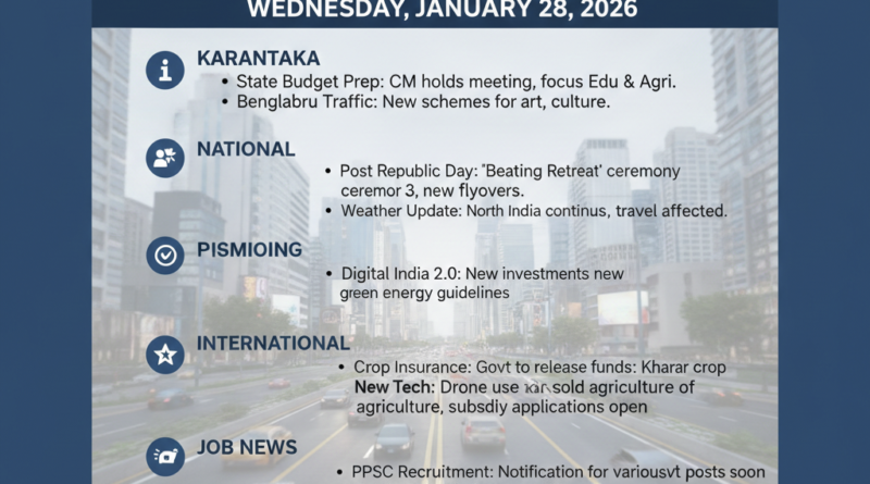 Read Moreದಿನಾಂಕ: ಜನವರಿ 28, 2026 | ಸ್ಥಳ: ಬೆಂಗಳೂರು/ಹಾವೇರಿ 1. ರಾಜ್ಯ ಬಜೆಟ್ 2026: ರೈತರು ಮತ್ತು ಶಿಕ್ಷಣಕ್ಕೆ ಹೆಚ್ಚಿನ ಆದ್ಯತೆ? ಮುಂದಿನ ತಿಂಗಳು ಮಂಡನೆಯಾಗಲಿರುವ ರಾಜ್ಯ